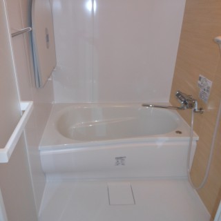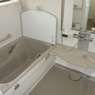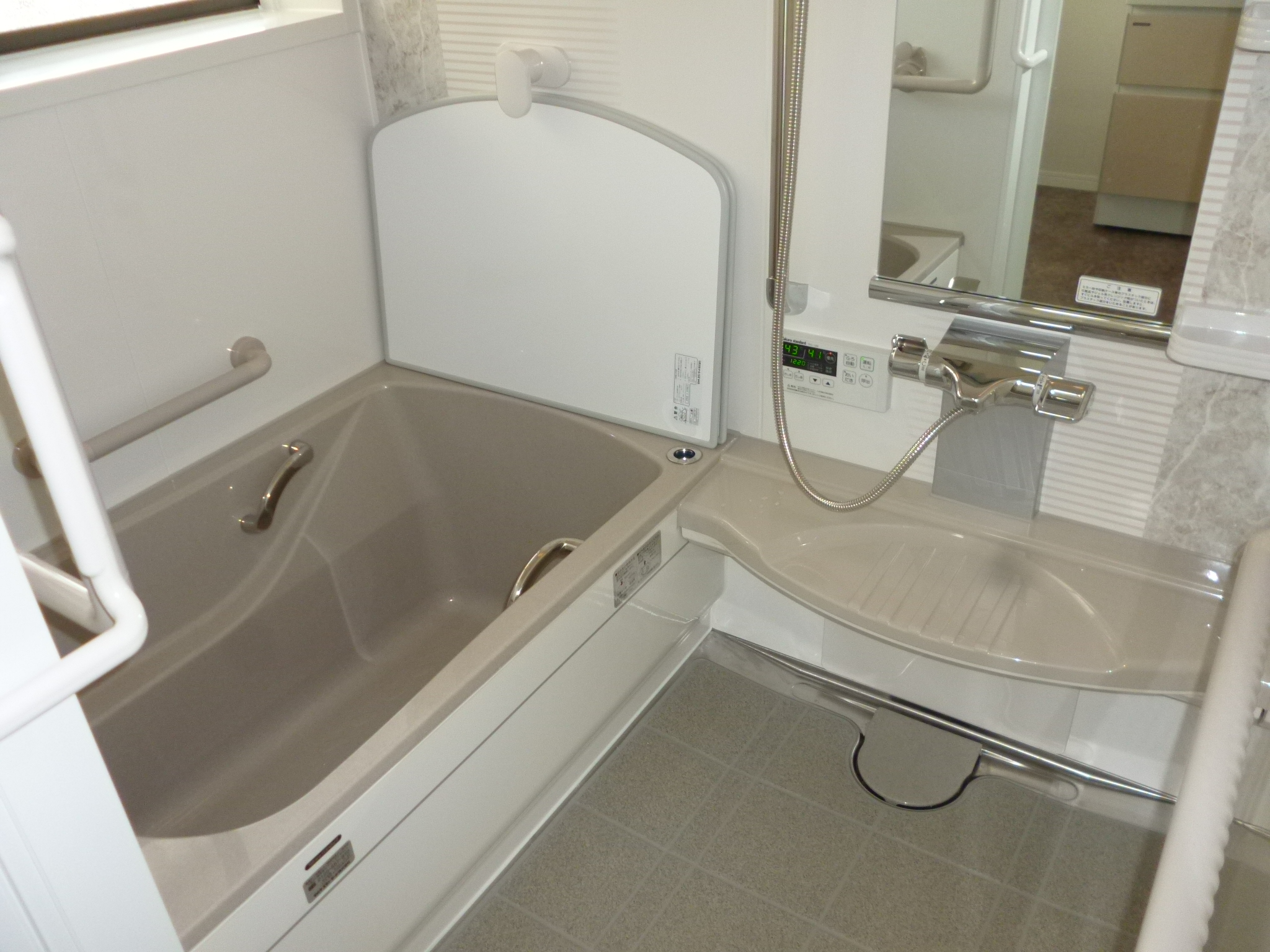 落ち着きのある色合いで人造大理石浴槽を採用。誰にでも使いやすい浴室であるための工夫があり、滑りにくいフロアや安心ハンドバーの設置、浴槽グリップ、ワンプッシュ排水栓など、ちょっとしたことが人に優しくなってます。年齢問わず快適なバスタイムになる仕上がりになりました。