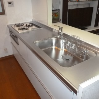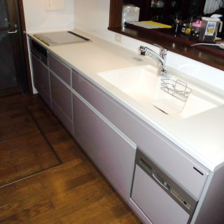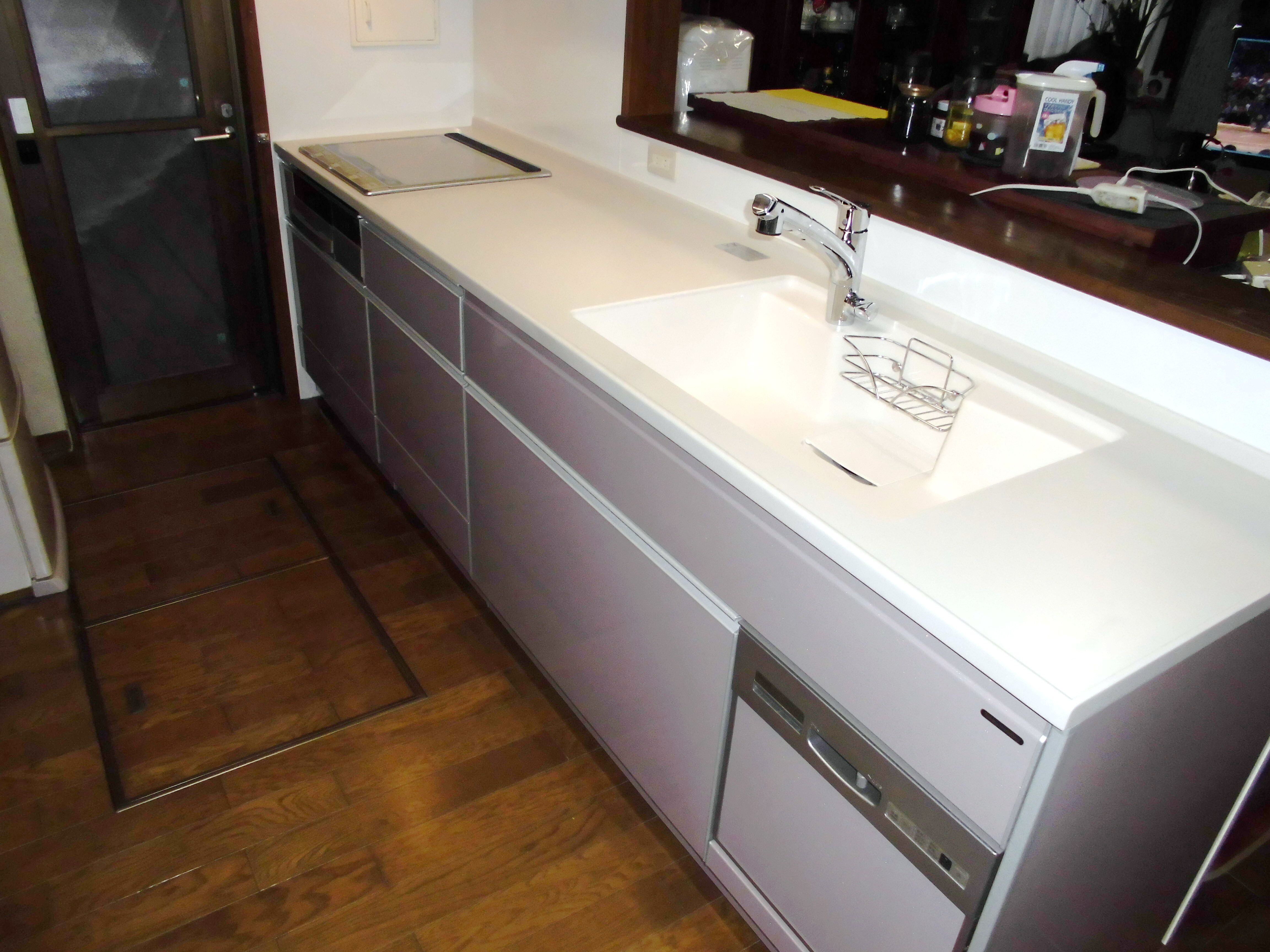 シンクは人造大理石を選択。色あせず、耐久性もバツグン!シンクの大きさは変わりましたが、その分調理スペースが広くなり、表に置いていた浄水器を蛇口一体型にしたことでフリースペースが確保できました。工事にとても満足のお声を頂き出会いに感謝でした。
