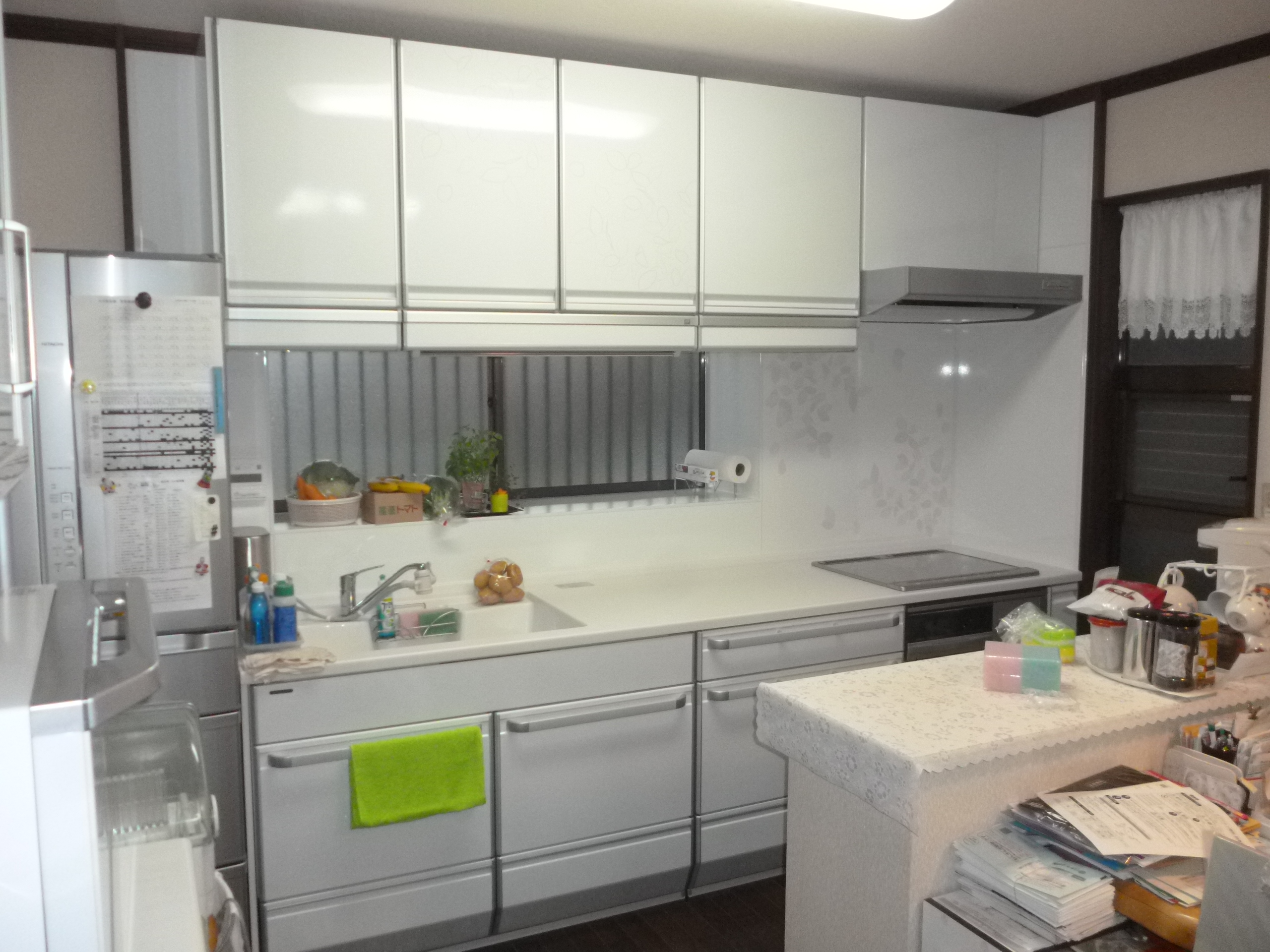 きっかけは、換気扇の位置が調理器からずれているので改善したいとの希望でした。お話を伺っているうちに、たくさんある吊戸は全く使えていないので不要、出窓の開閉が棒を使わないとできない事、ガス調理器付近の壁面の汚れが付着しにくいものに変えたい、画像では見えにくいですが、キッチンが広いため、食器洗浄機・冷蔵庫・その他の調理家電の動線が悪いなどの問題がありました。