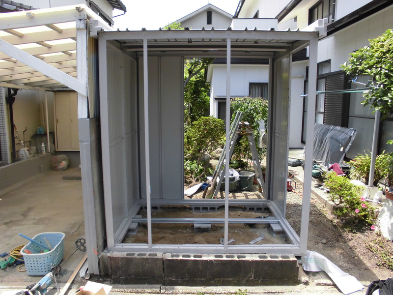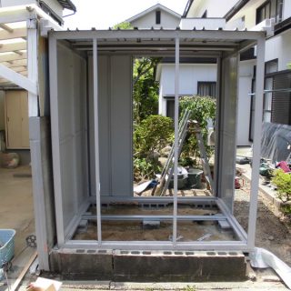 ご主人様手作りの物置でしたが、老朽化したため倉庫と門扉の設置工事を依頼されました。