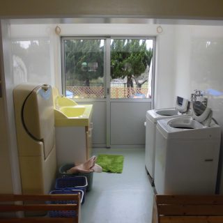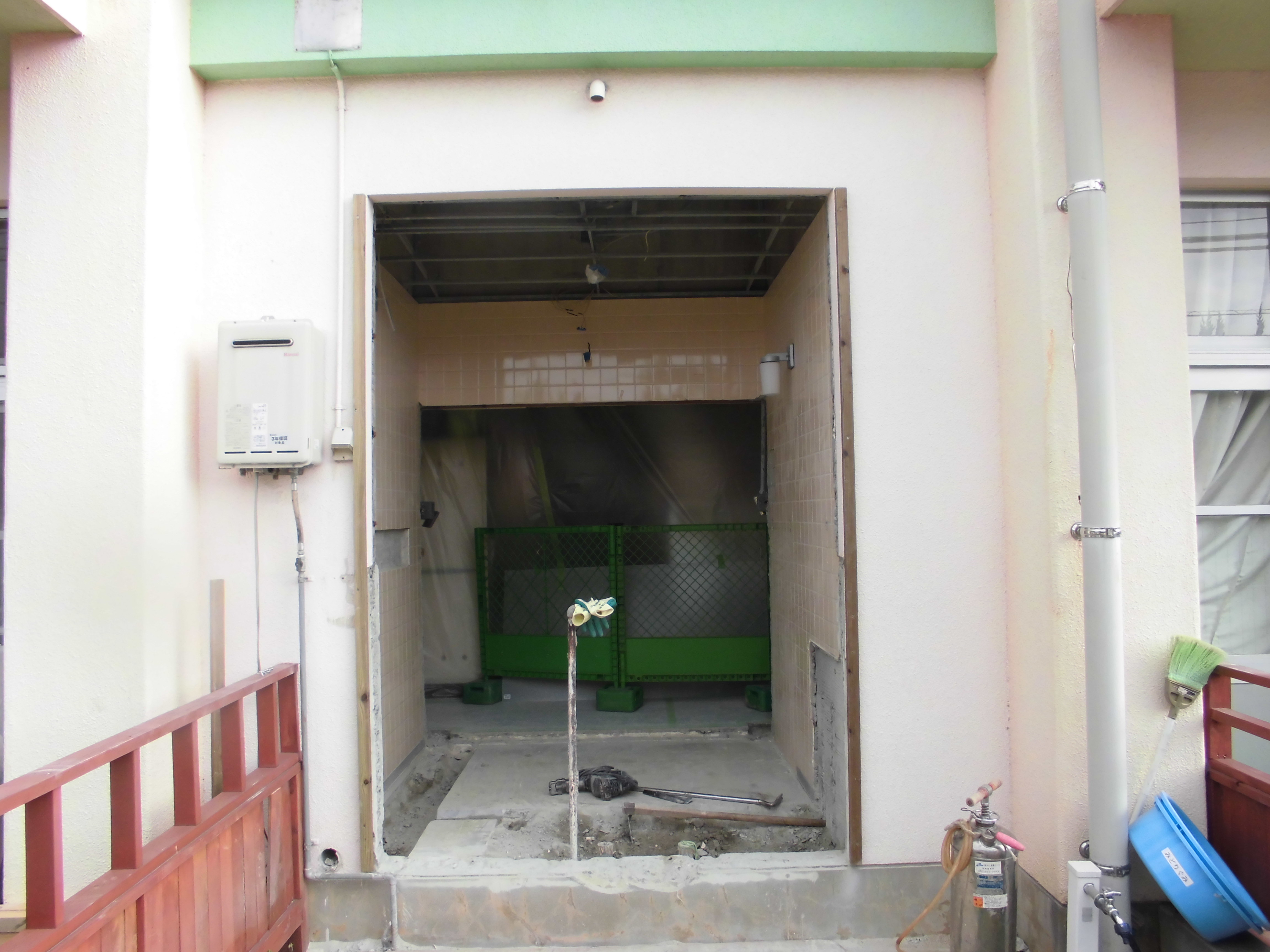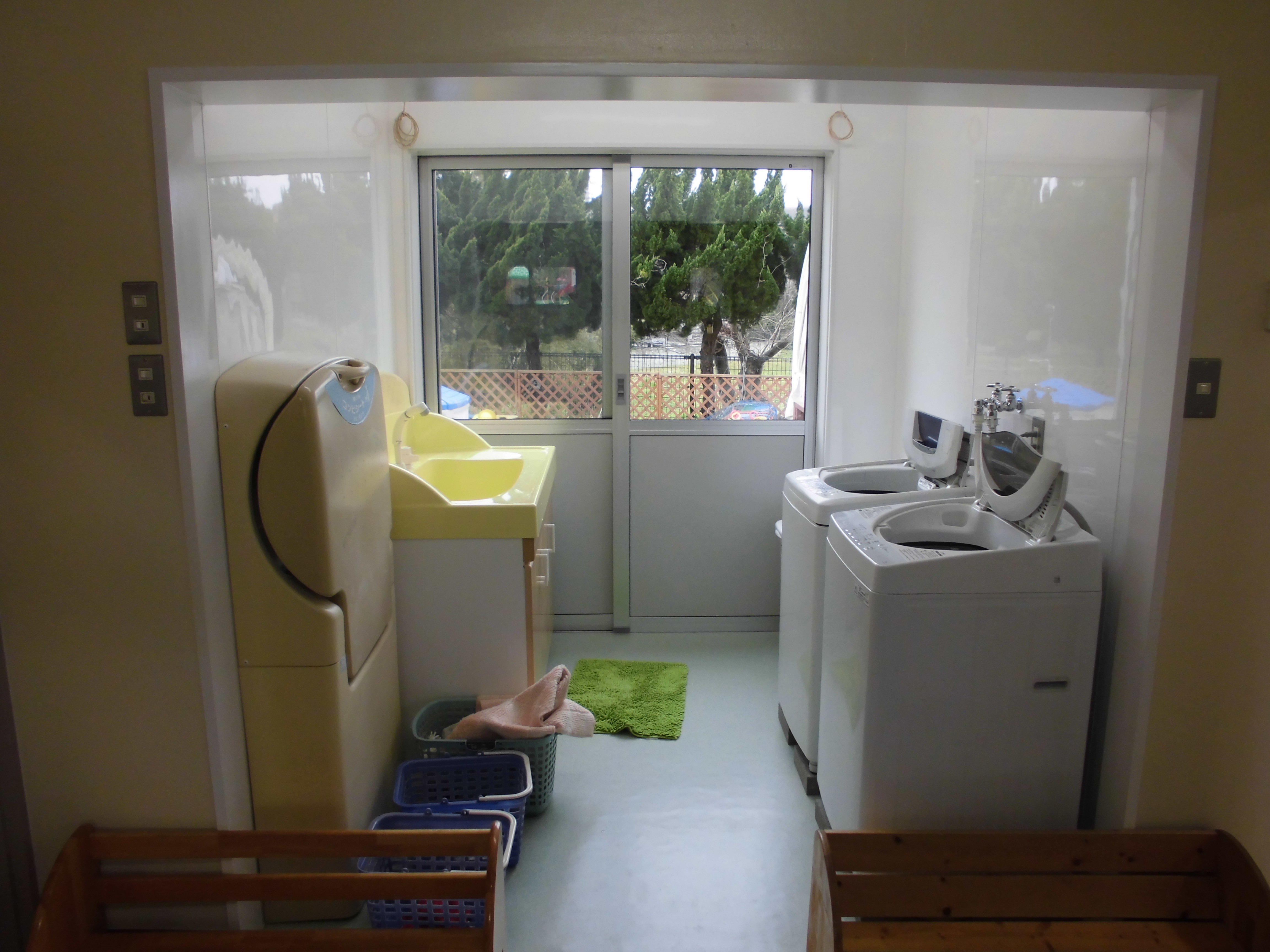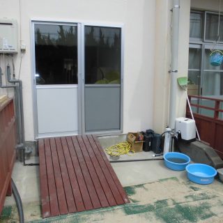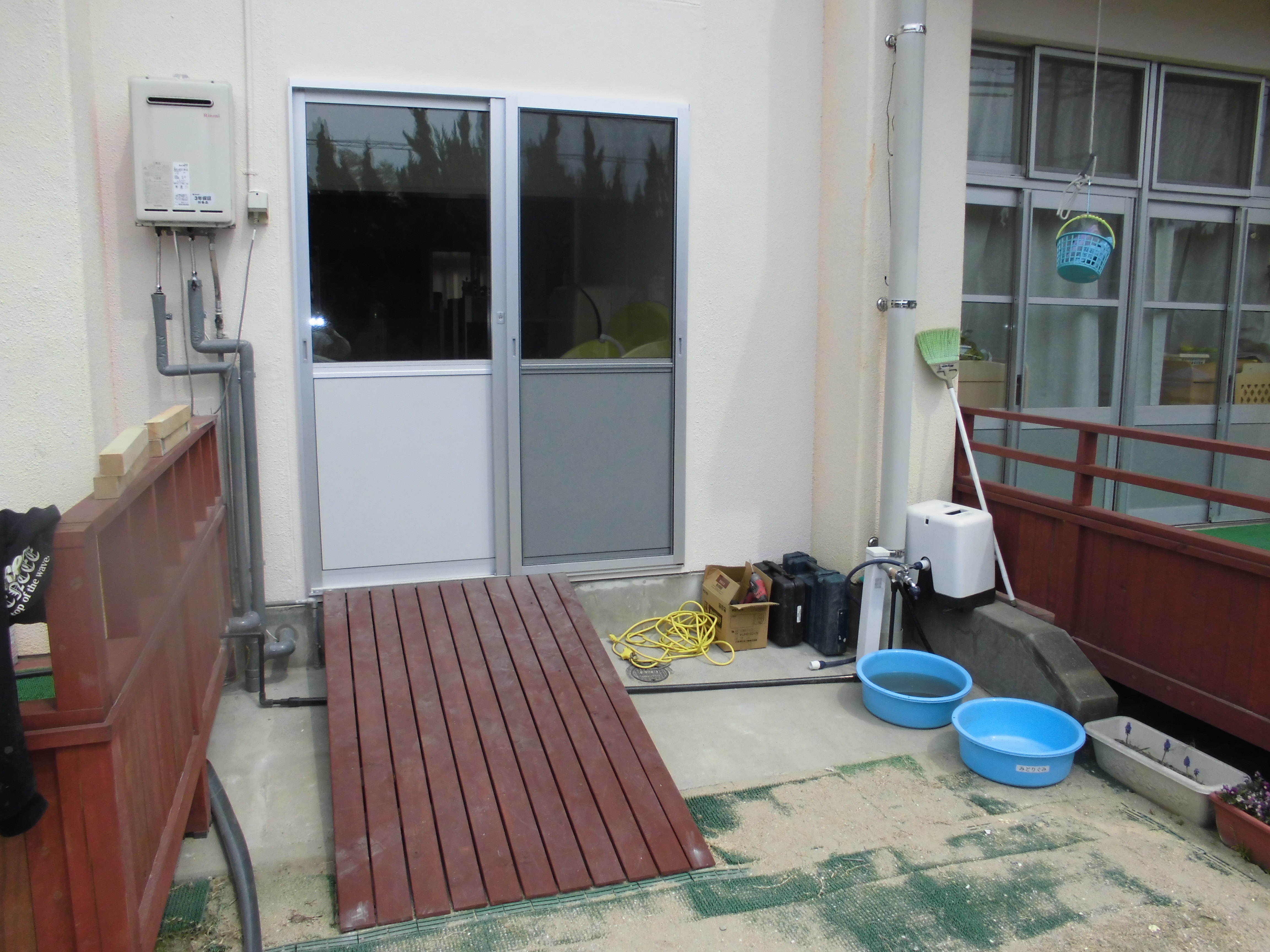 保育園のシャワーパンの取替が主の工事で、天井、壁、床を既存のタイルから化粧不燃材の仕上げに。既存窓を引き違いの戸にし、出入りできるようにしました。