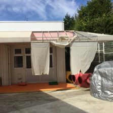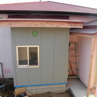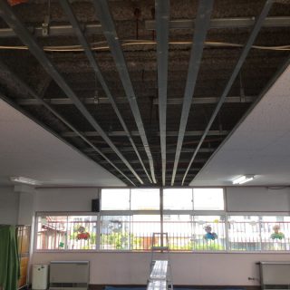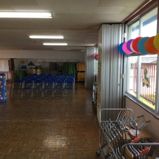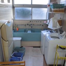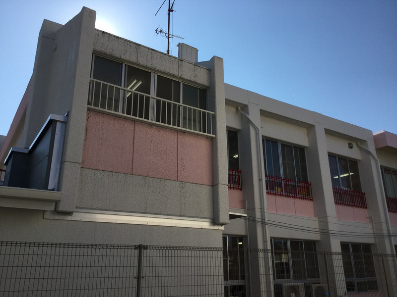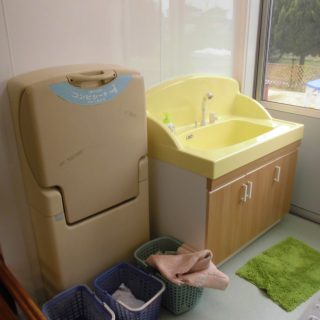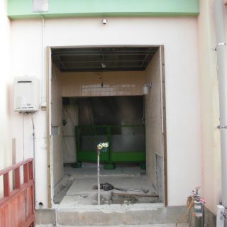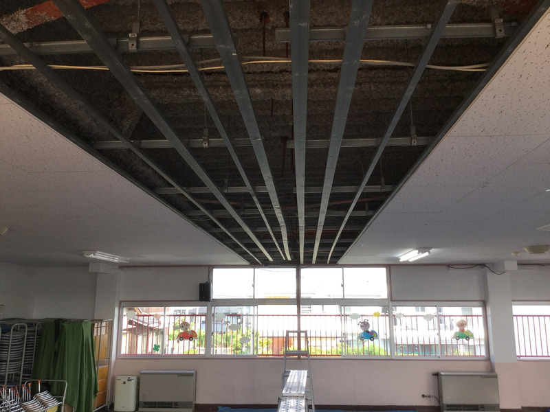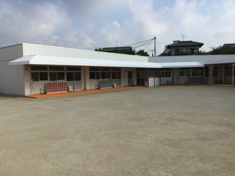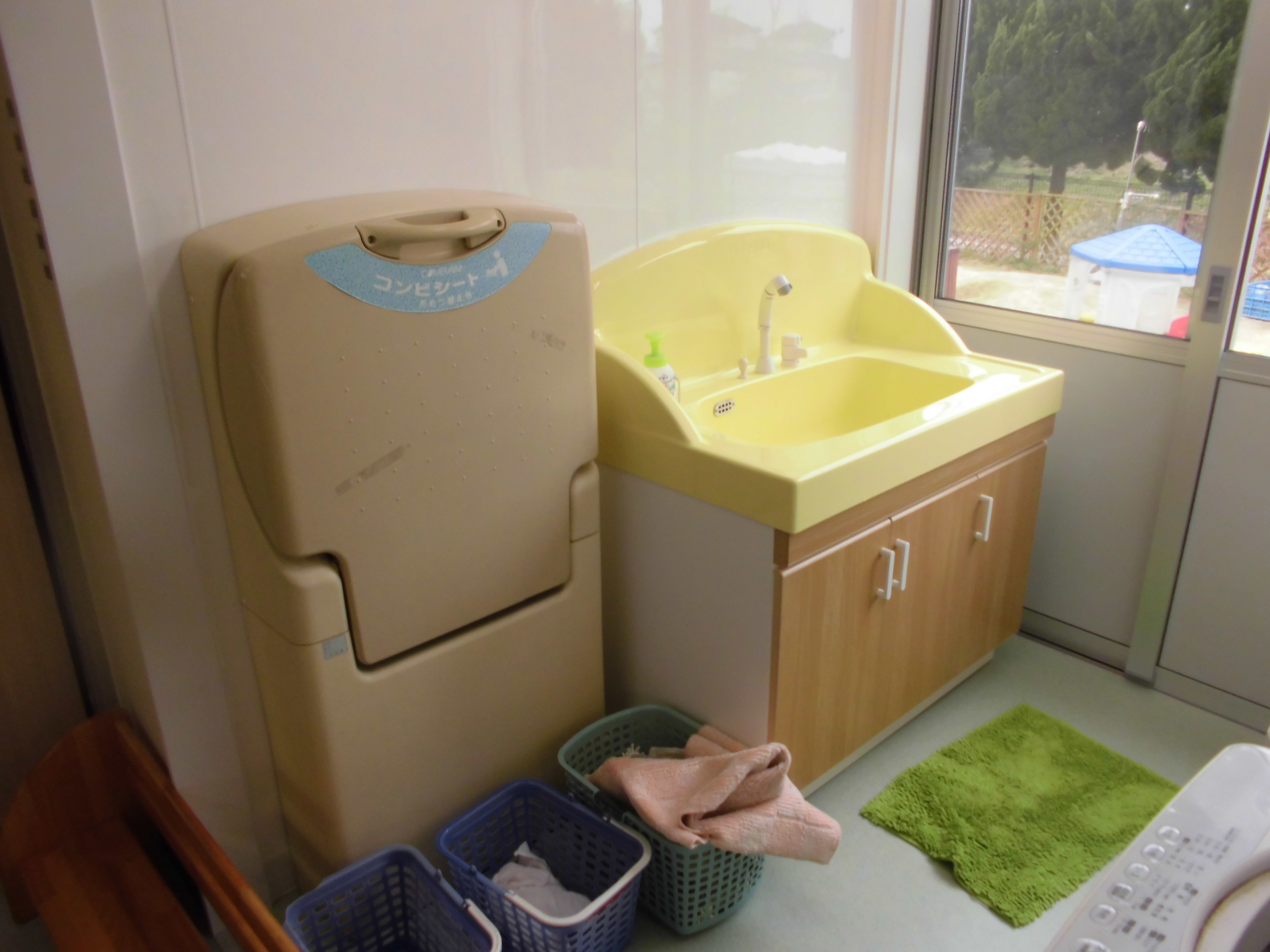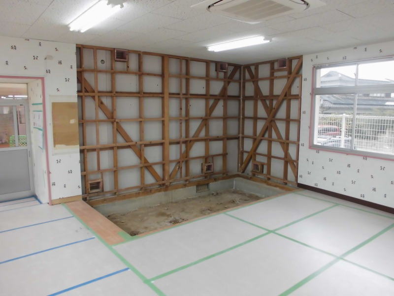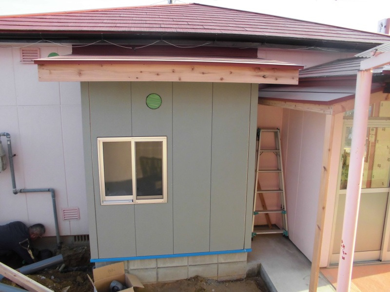 保育園のシャワーパンの取替が主の工事で、天井、壁、床を既存のタイルから化粧不燃材の仕上げに。既存窓を引き違いの戸にし、出入りできるようにしました。