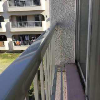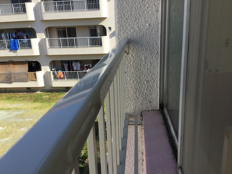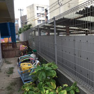 【ビフォー】既存は木製の目隠しフェンスでしたので、老朽化で木部が外れていた箇所もあり、今回はアルミ製のメッシュフェンスに