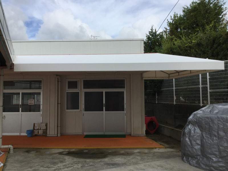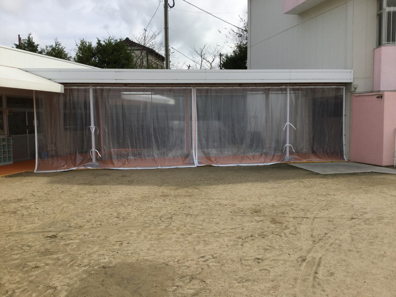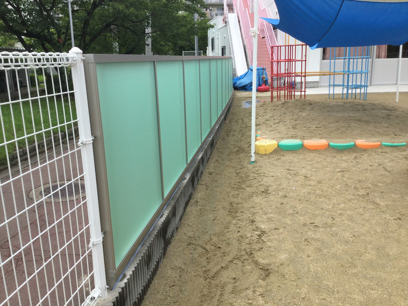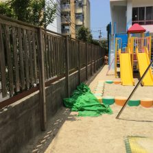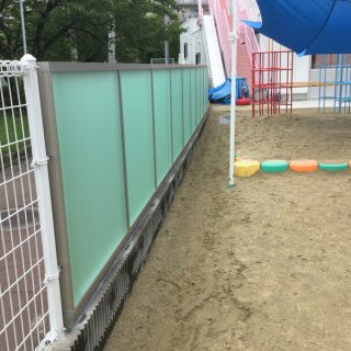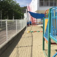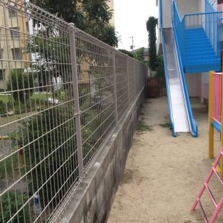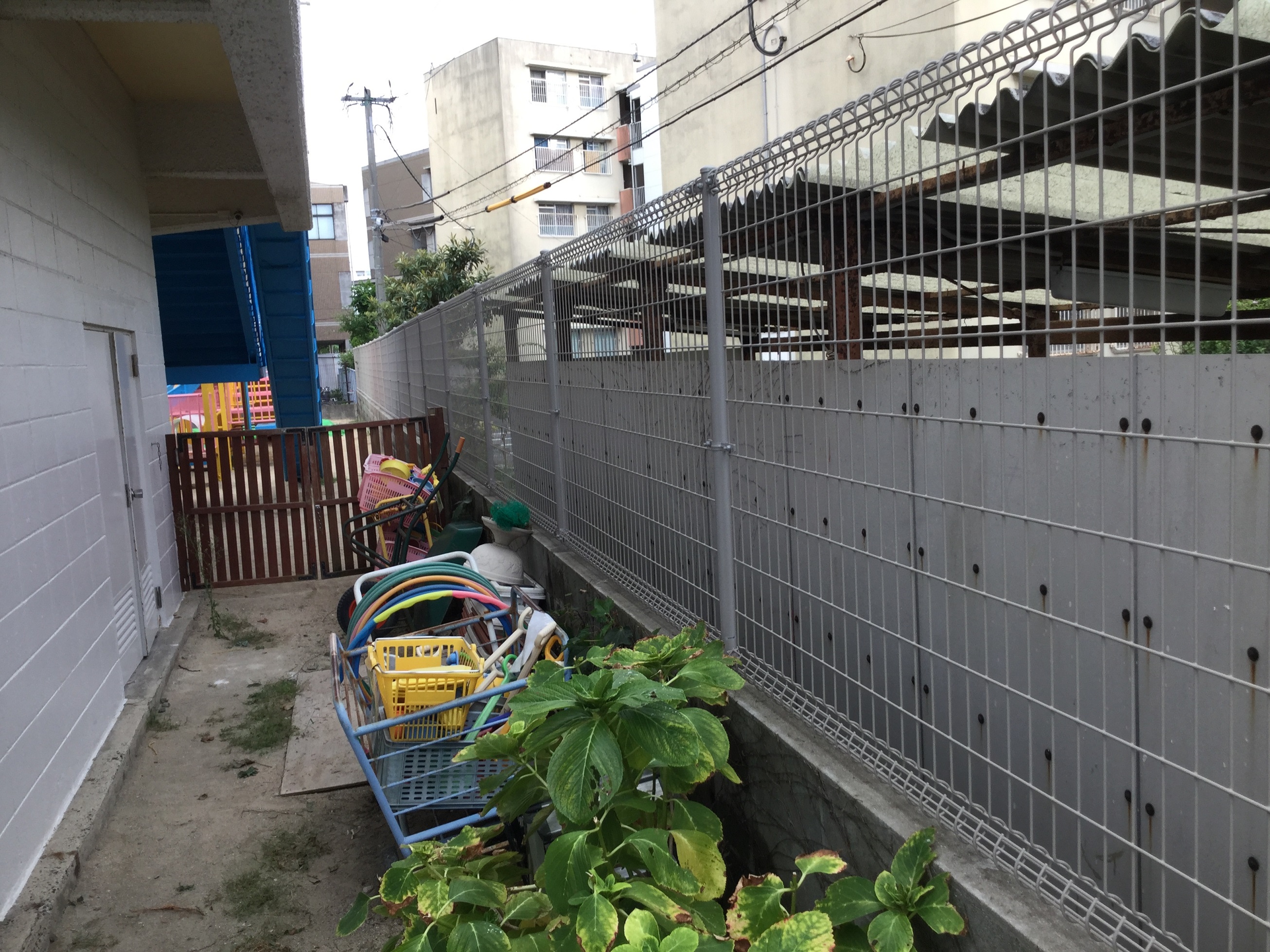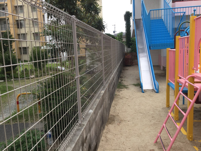 【ビフォー】既存の網フェンスから、園児さんへの配慮を考え、目隠し兼用の半透明フェンスに取替ました。