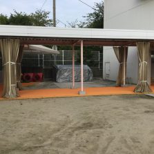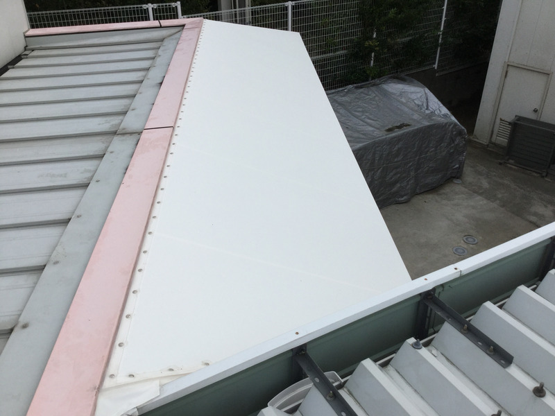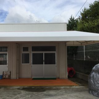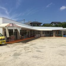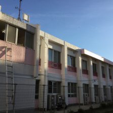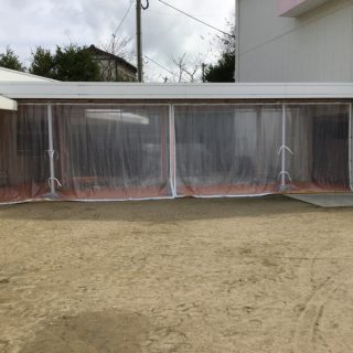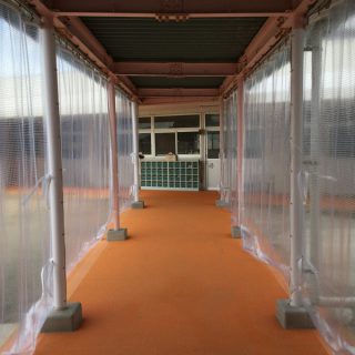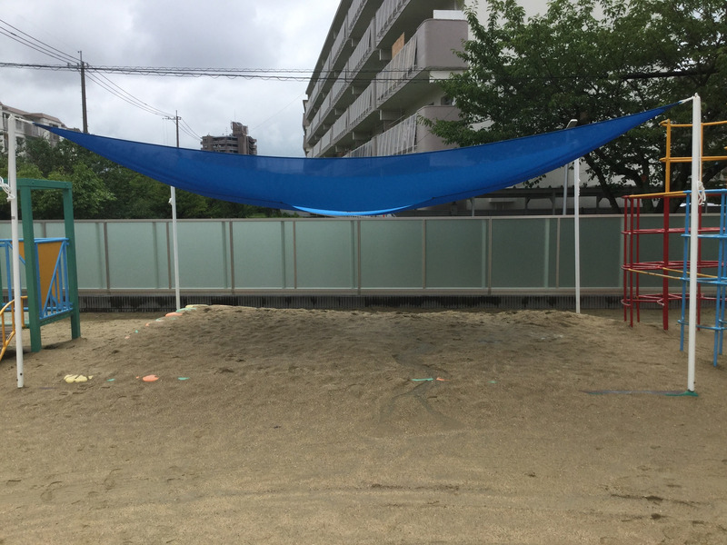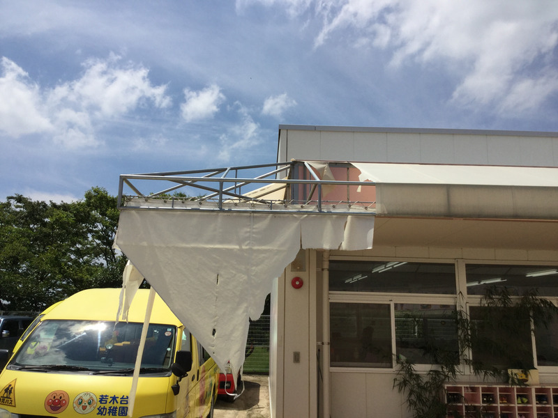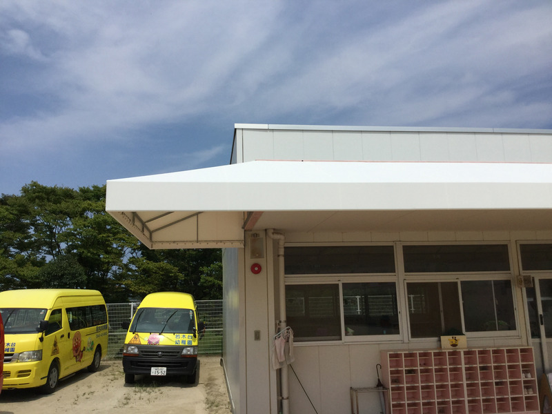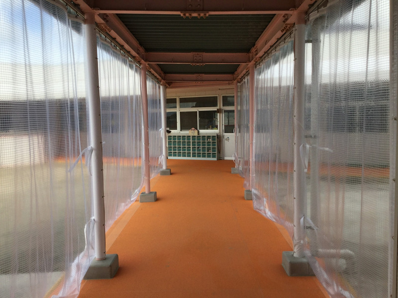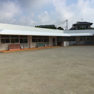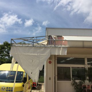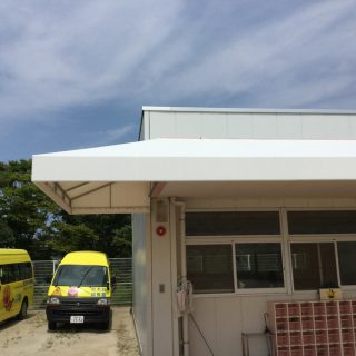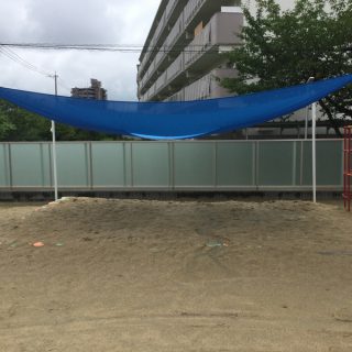 【ビフォー】既存の網フェンスから、園児さんへの配慮を考え、目隠し兼用の半透明フェンスに取替ました。