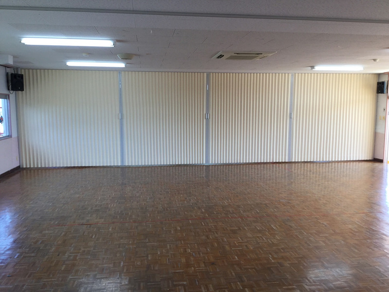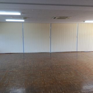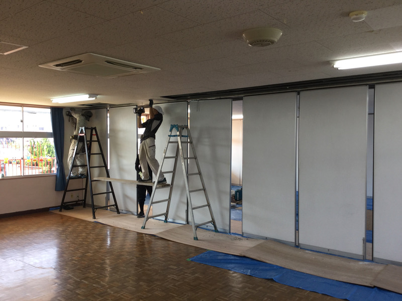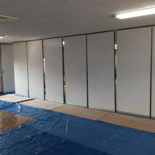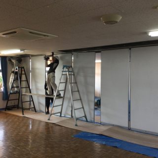 【ビフォー】スチール可動式のパーテーションでしたが、戸車の調子が悪く開閉が困難になっていました。今回は軽い力で開閉できるアコーディオンタイプに取替工事です。