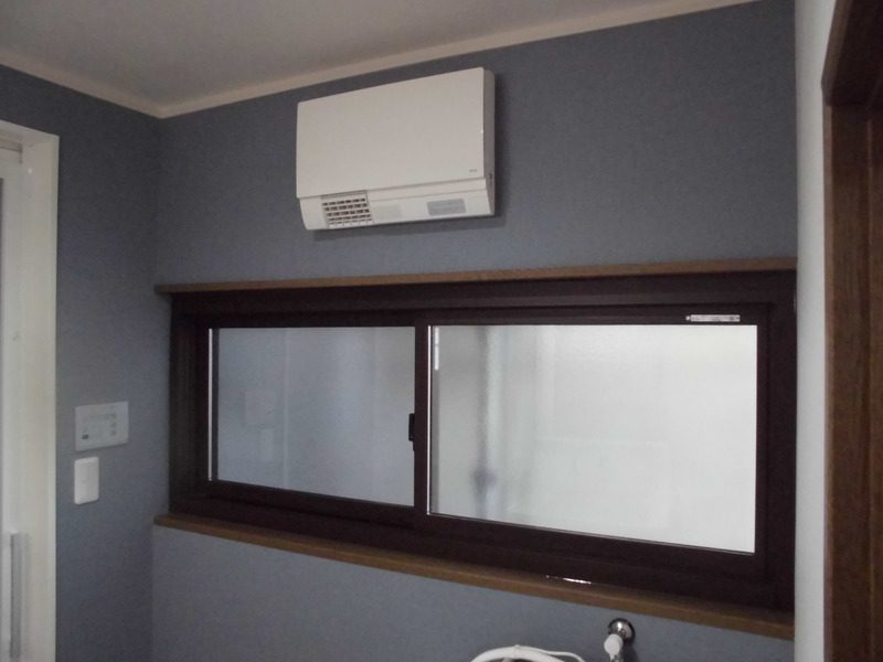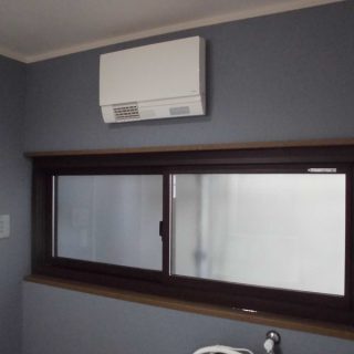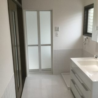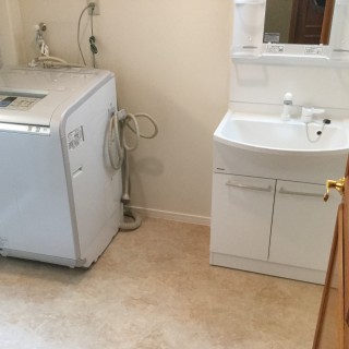 洗面収納棚にすっきりと納まる専用の籠をオプションで購入されたことで、脱衣類やタオルの収納などに使えます。洗濯機を移動したことで、浴室への出入りがスムーズになったことと、洗面所にも暖房機器と壁に設置しました。