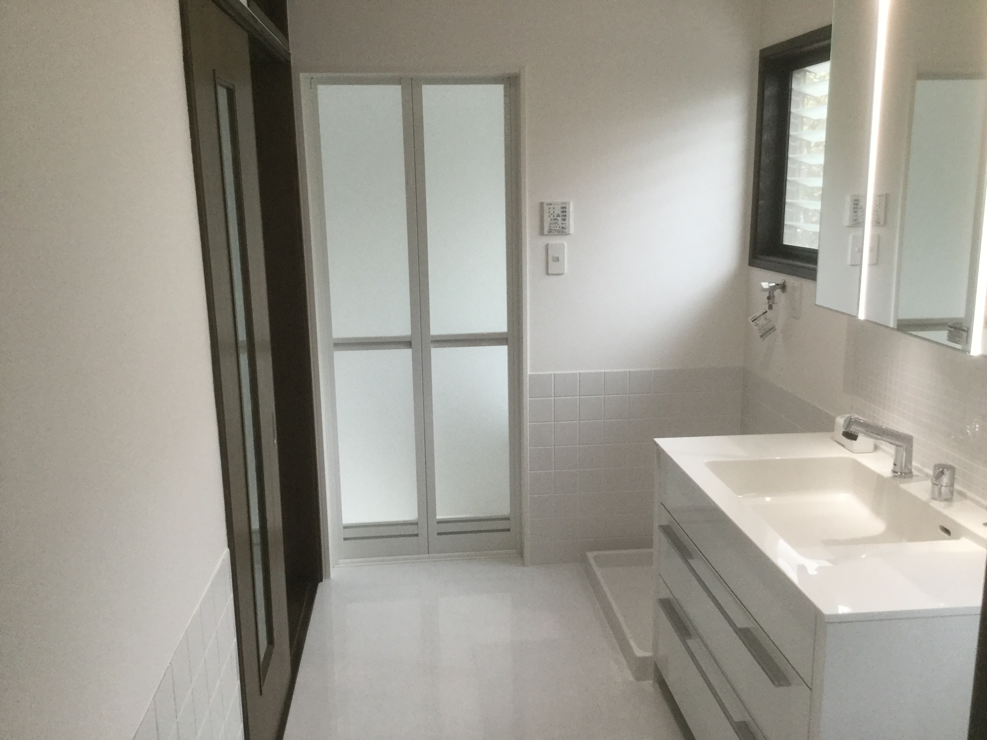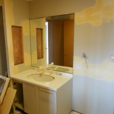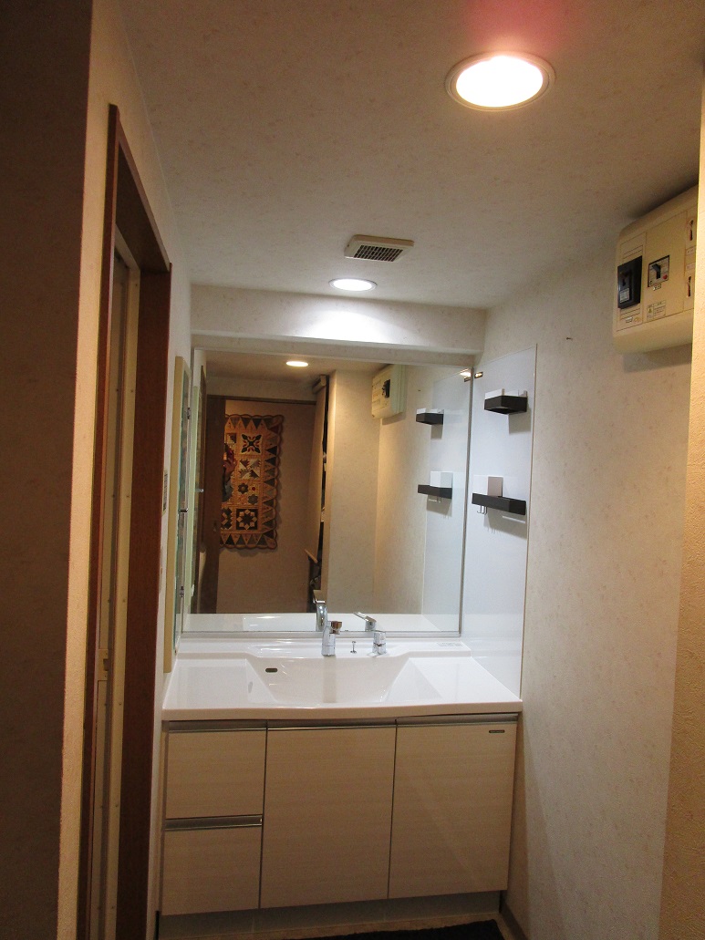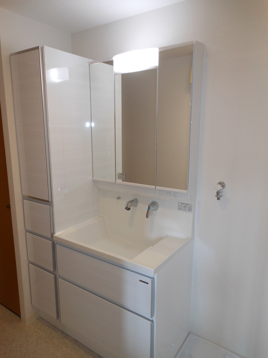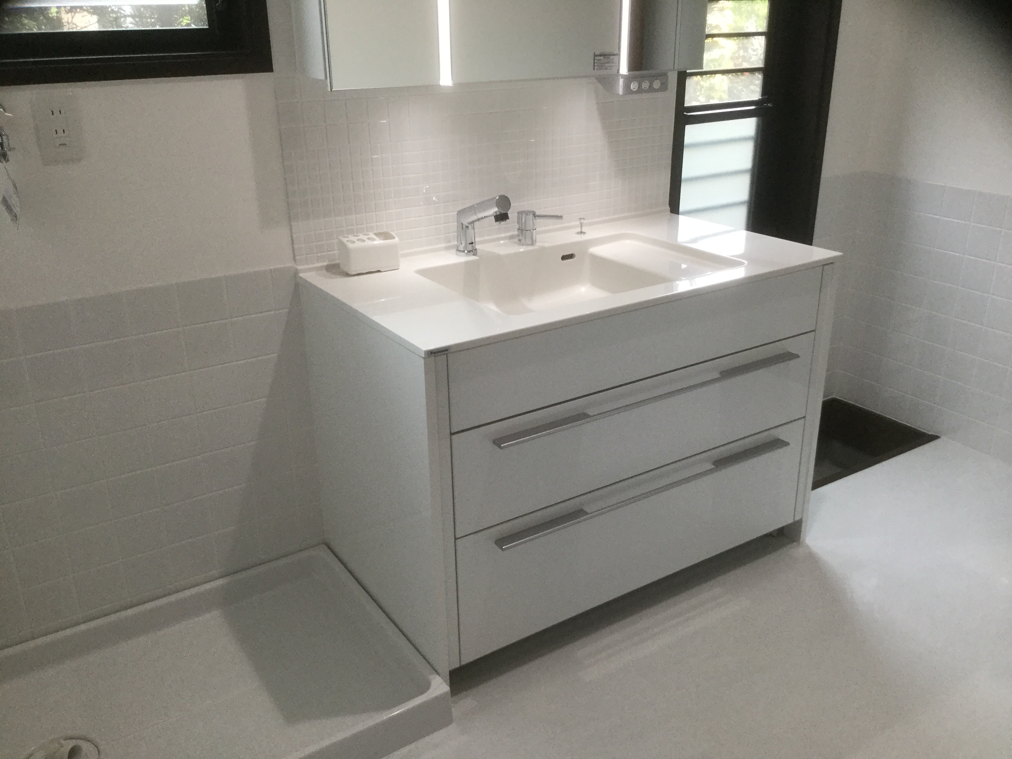 洗面はサイドに水撥ねし、壁面に水が浸透したりするので、水がかかっても大丈夫なように