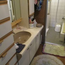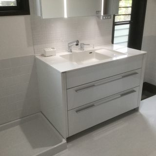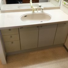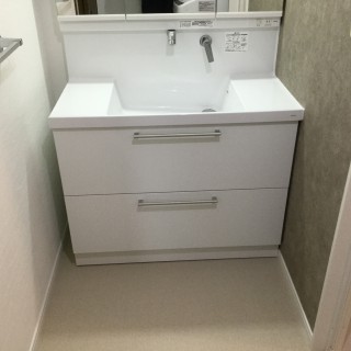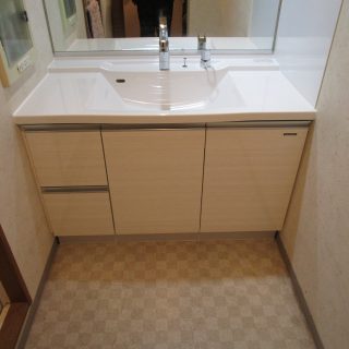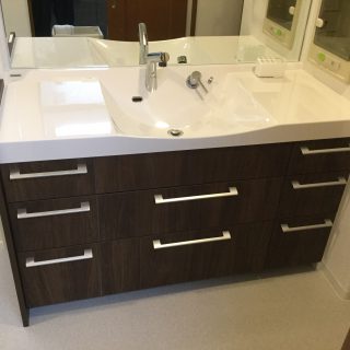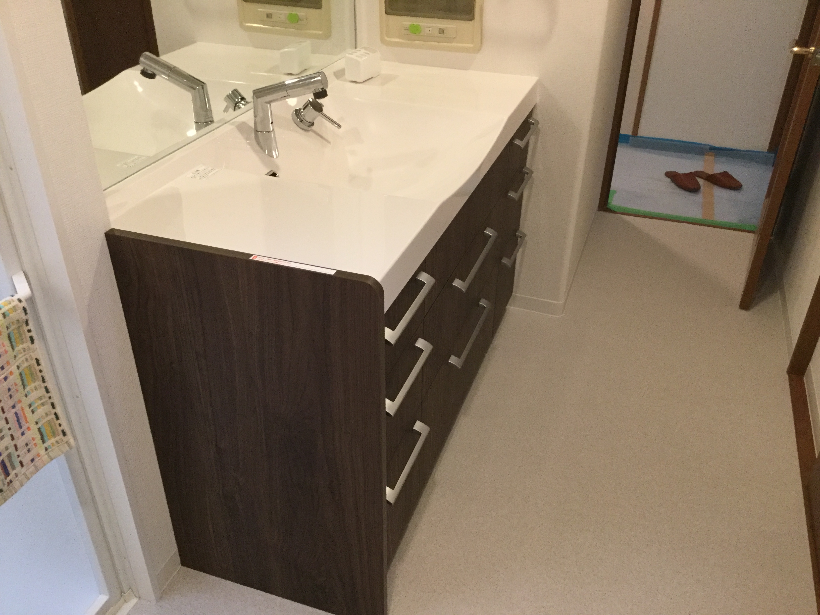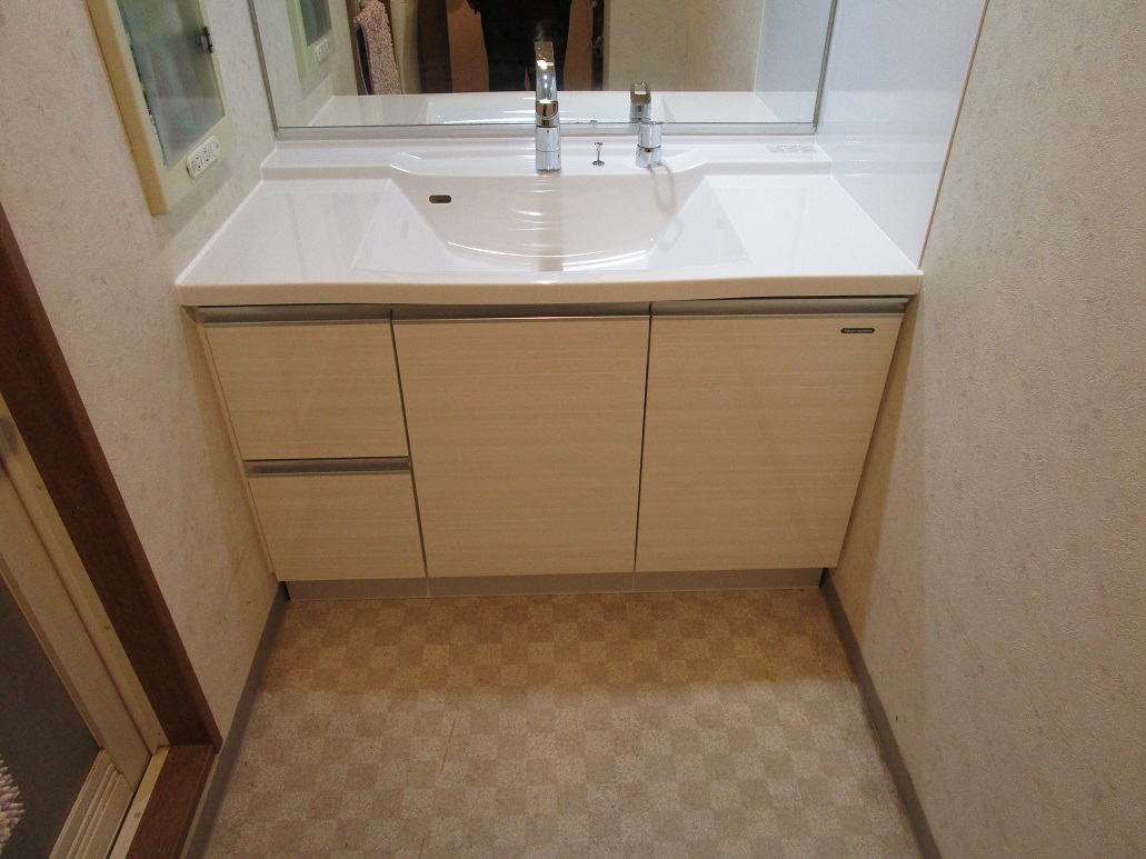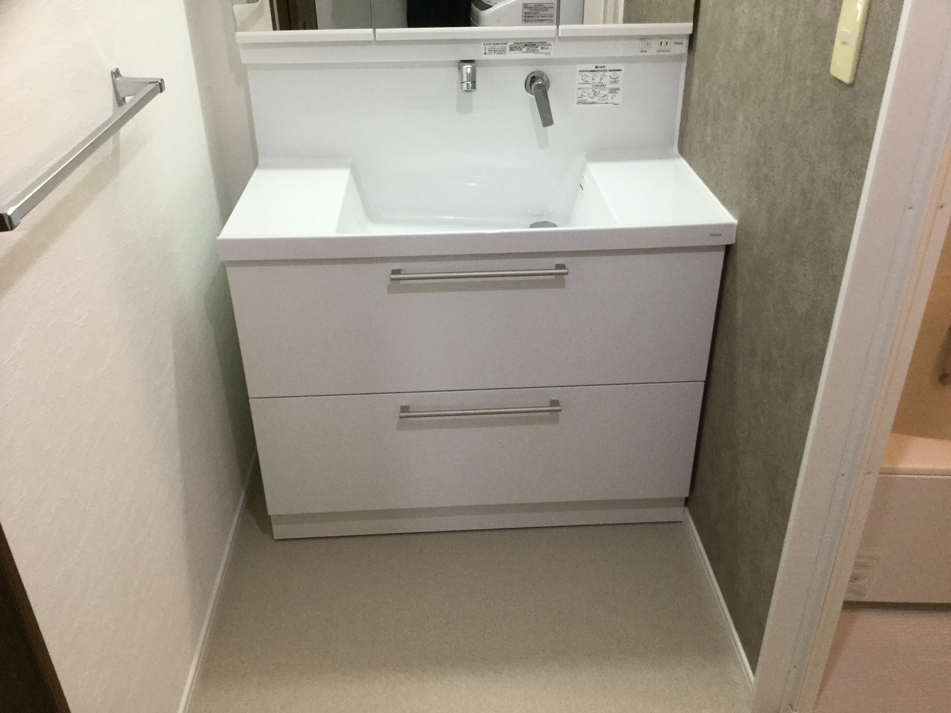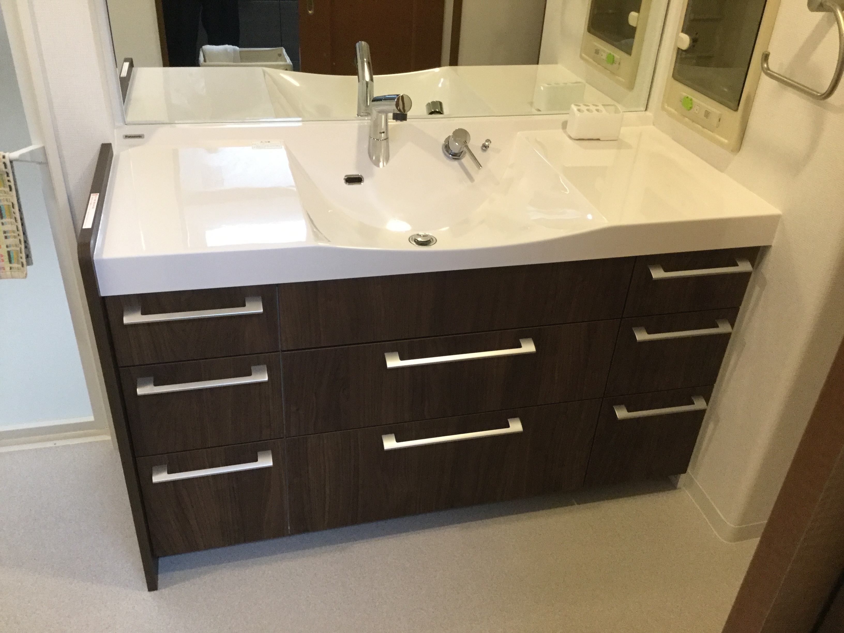洗面台が既成のサイズでは隙間が空くため、ピッタリサイズは対応できるタカラの商品で提案しました。