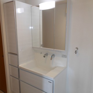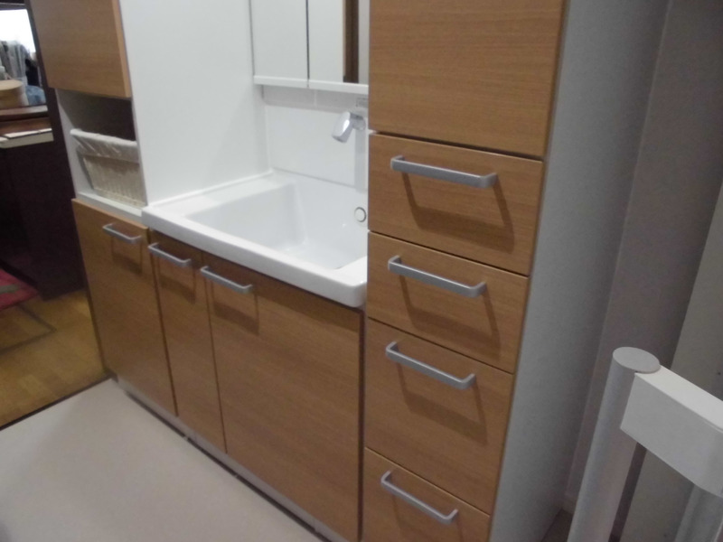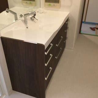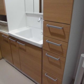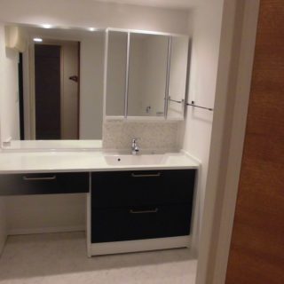 ドラム式洗濯機と洗面台と並べて設置するため、開閉具合なども考え残りの寸法でプランを話し合いました。細部のオプションにこだわり、家族の必要とする機能を重視し洗面台+トールキャビネットを組み合わせました。また、扉のデザインも標準よりワンランクUPされたことで、より高級感ある洗面室の空間になりました。