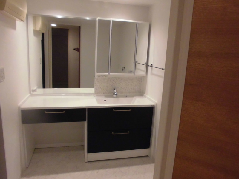 サイドのエンドパネルで仕上げました。3面鏡の背面には、2.5角のモザイクタイルを貼りました。